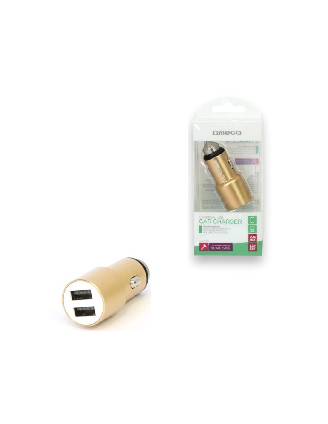 Cargador de coche Omega de tamaño pequeño, con dos puerto USB. Cargador especial que permite romper la ventanilla del coche en caso de emergencia. Aplicable a casi cualquier dispositivo alimentado por USB. Puerto USB de carga rápida. Compacto y porátil, muy fácil de llevar. Protección ante cortocircuitos, sobrecorriente y sobrecalentamiento. Entrada de 12/24V y salida de 5V máx. 2100mA.