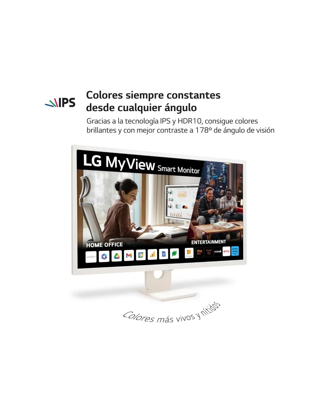 LG MyView Smart TV está diseñado para el trabajo y el entretenimiento. Mira tus series favoritas fácilmente desde múltiples plataformas de streaming y configura tu espacio de trabajo de manera rápida, con ordenador o sin él. El único con el que disfrutar de más contenidos en streaming como: RTVE, Mitele, Orange, Netflix, Prime Video, Disney+, Apple TV, YouTube, videojuegos y mucho más. LG MyView Smart Monitor WebOS23, más fácil, intuitivo y seguro.