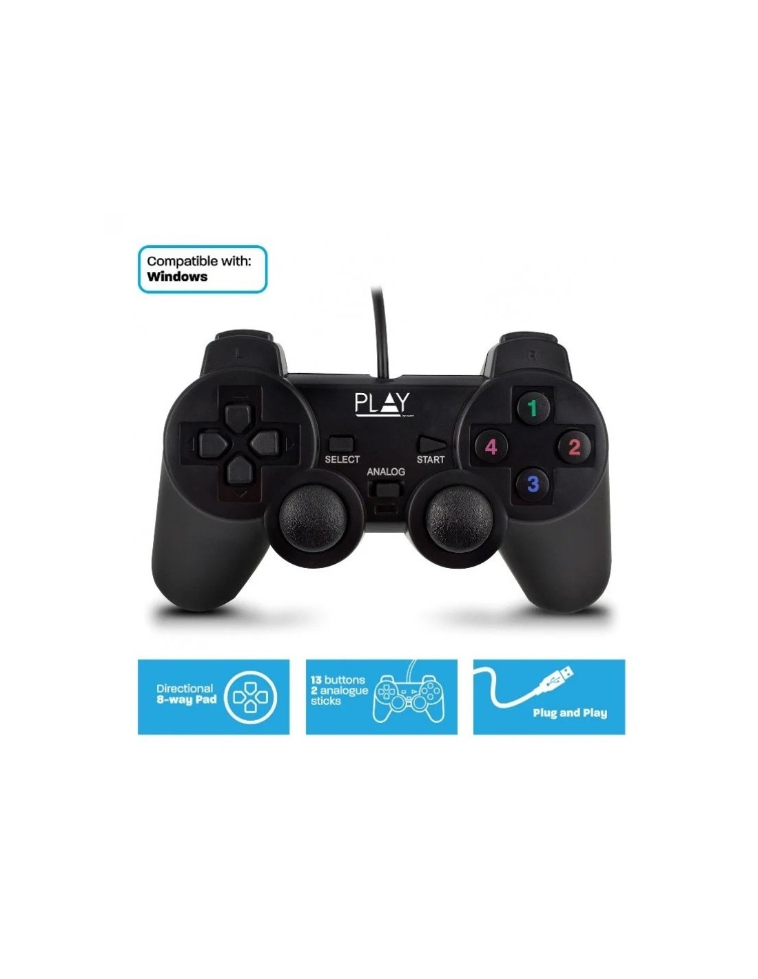 El Controlador para juegos con cable está equipado con 13 botones, 2 mandos verticales analógicos y control direccional de 8 vías. Ideal para juegos de carreras, de deportes y de rol. Disfrute de horas de juego y diversión gracias a su cómodo agarre. El Controlador para juegos con cable es un dispositivo plug and play, por lo que solo deberá enchufar el cable USB en su ordenador portátil o sobremesa, y ya podrá comenzar a jugar al instante.