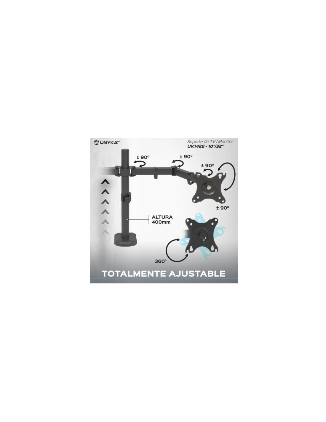 UNYKAch Soporte TV / MONITOR Dual de Escritorio para 2 Pantallas Planas y Curvas de 10-32 Pulgadas (hasta 10 kg brazo), 2 Brazos / 2 Cabezales, Ajustable y Giratorio, VESA máx 100 x 100 mm. Diseñado pensando en la comodidad y la eficiencia, este soporte UK1422 de doble brazo te permite montar 2 pantallas, una al lado de la otra y crear el entorno de trabajo ideal. Siéntete cómodo y mejora tu postura con nuestro sistema de brazo dual articulado. Puedes ajustar la altura, inclinación, y giro de tu monitor para adaptarlo a tus preferencias personales, reduciendo la fatiga visual y aumentando la productividad.